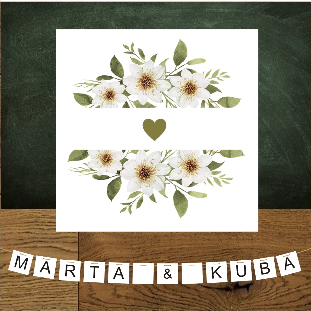 Banerek ślubny z serduszkiem i kwiatami jaśminu.