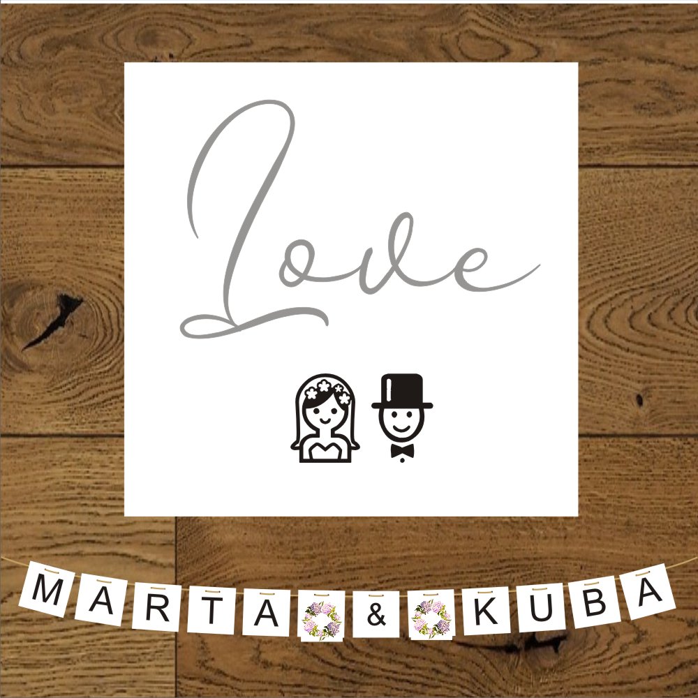 Baner weselny na wesoło ze śmiesznym piktogramem.