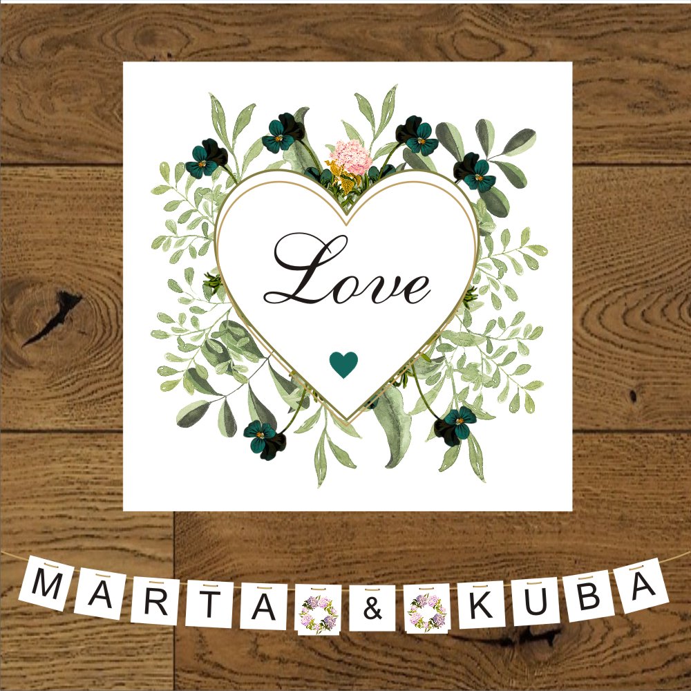 Baner weselny w kolorach zieleni i szmaragdowych kwiatów z romantycznym sercem.