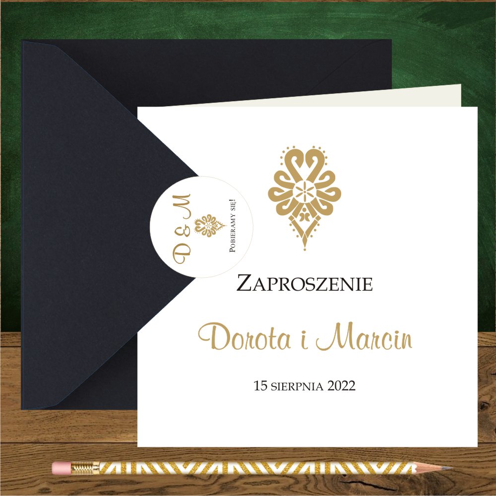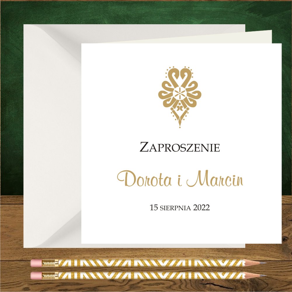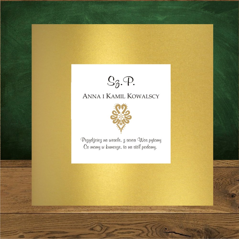 Zaproszenia na ślub góralskie z góralską parzenicą. Parzenica złota, proste