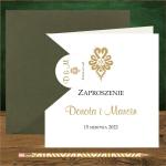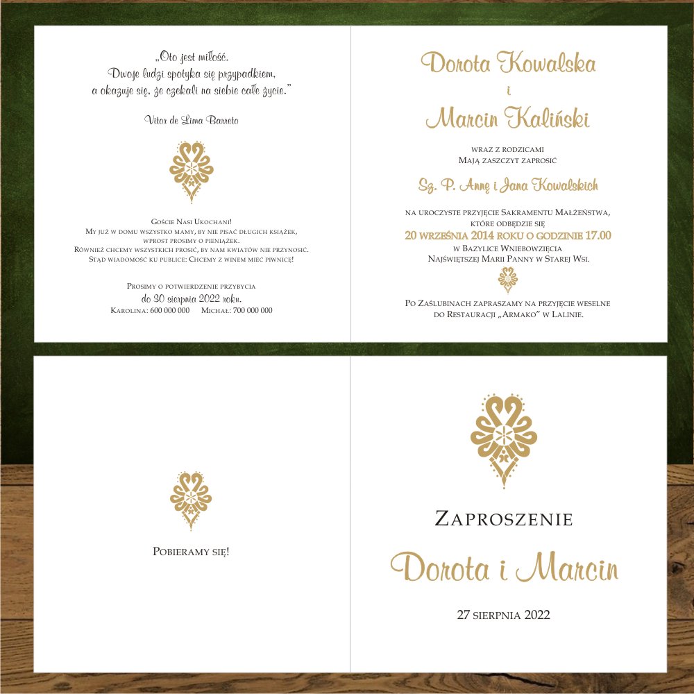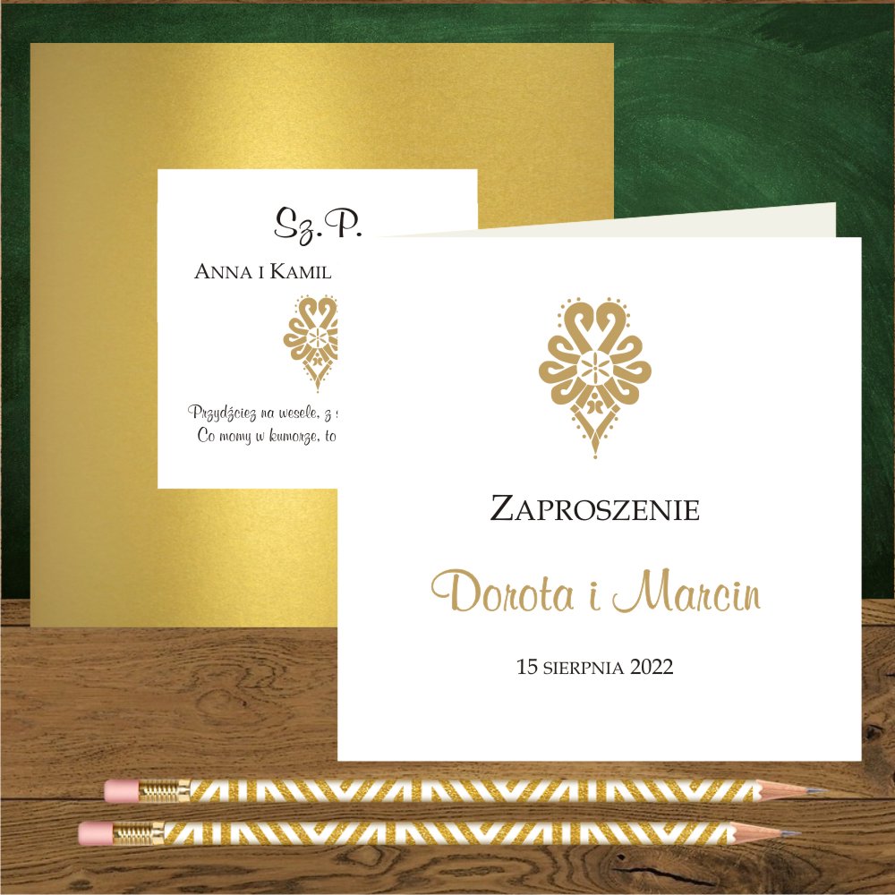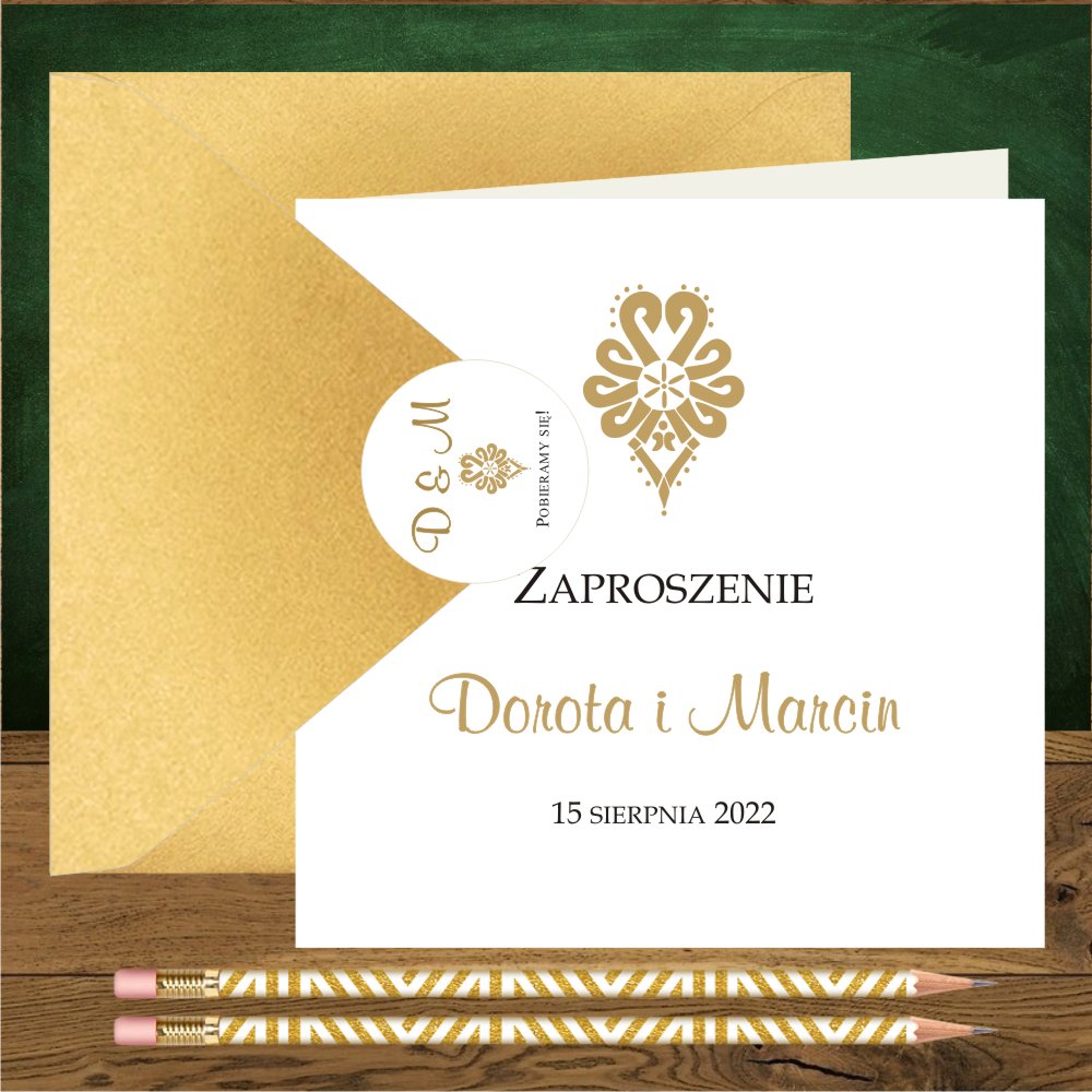 Zaproszenia ślubne góralskie z góralską parzenicą w kolorze złotym. Parzenica złota