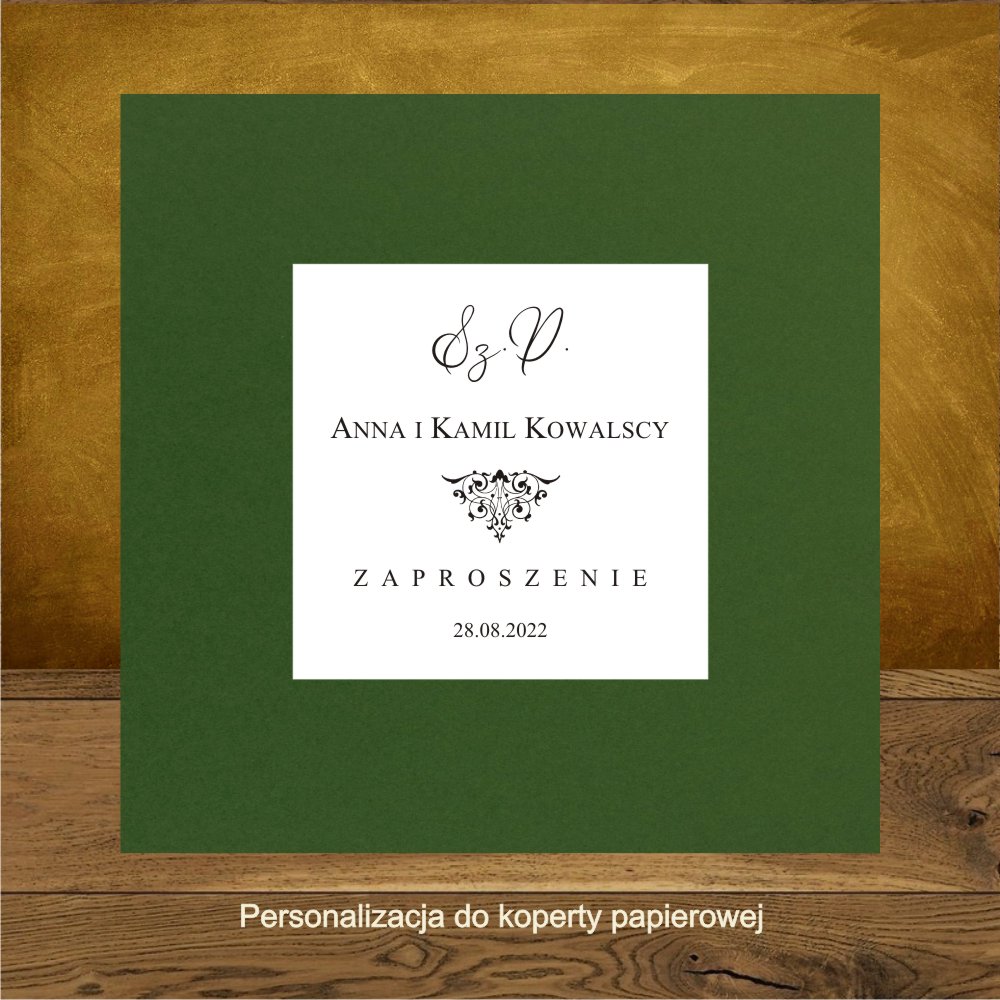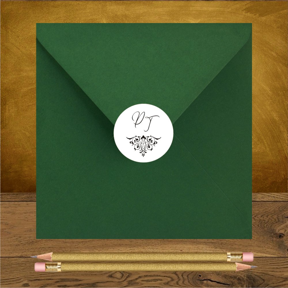 | Naklejka na kopertę w kształcie kółeczka. Wykonana z papieru takiego jak użyty w zaproszeniach. W przykładzie koperta zielona. |