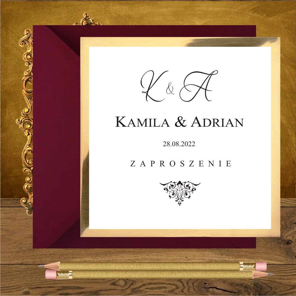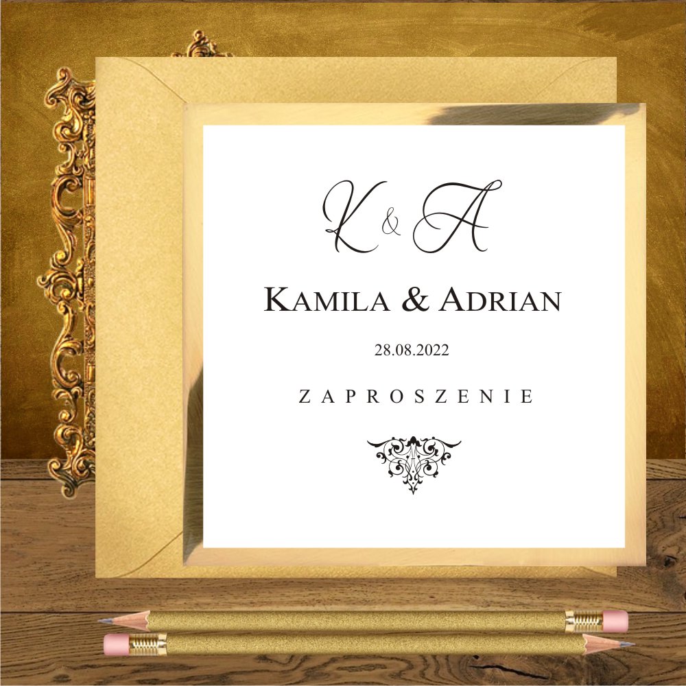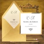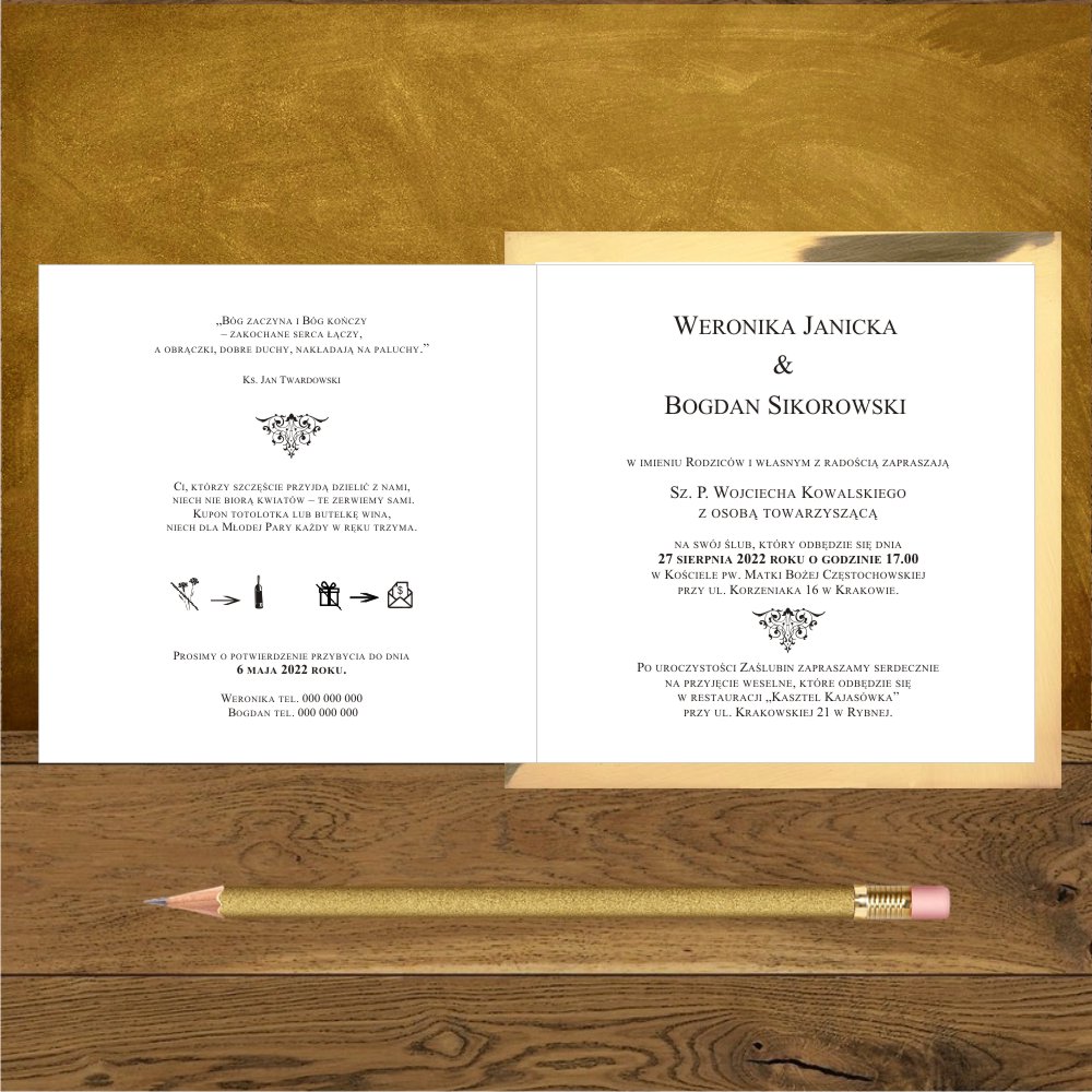 Eleganckie, stylowe złoto czarne zaproszenia na ślub wykonane z papieru białego i złotego. Na froncie widnieje oryginalny ornament. Wzór bardzo nowoczesny i minimalistyczny