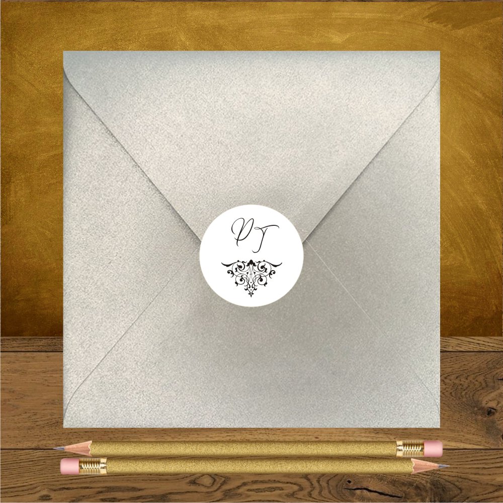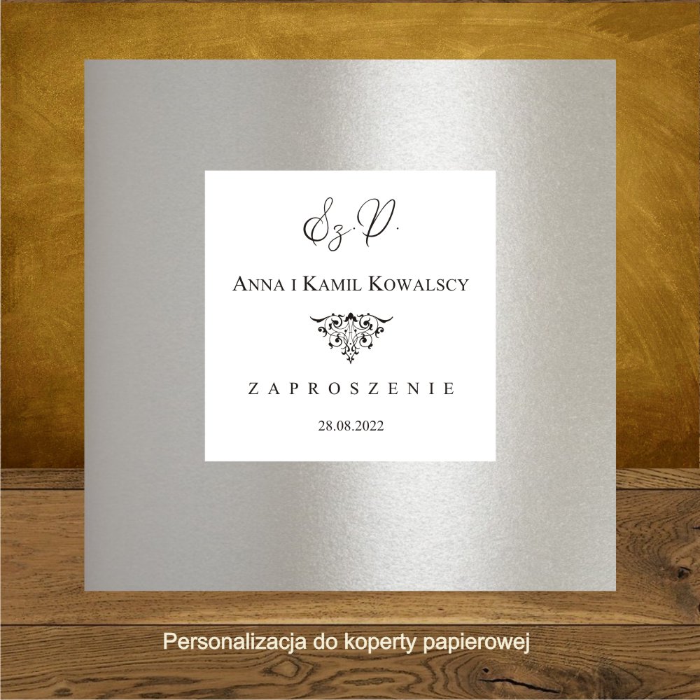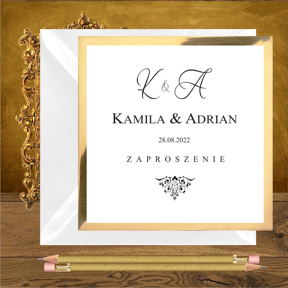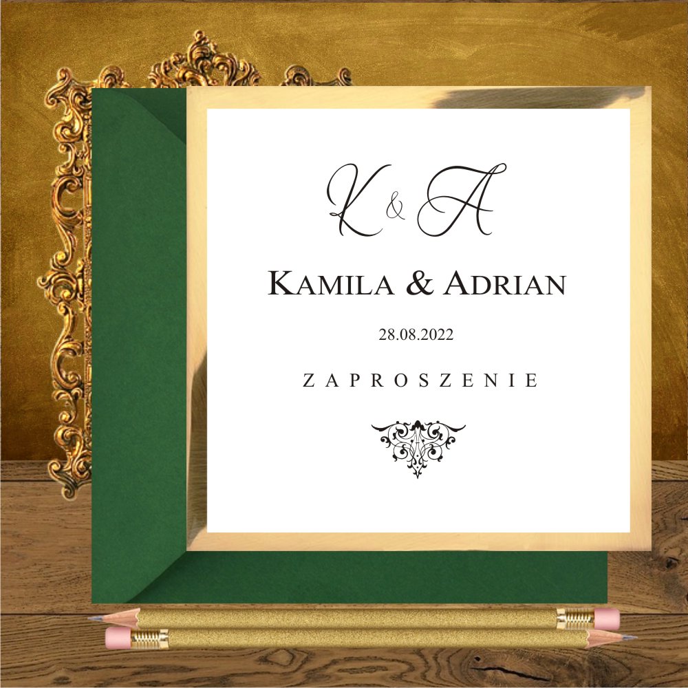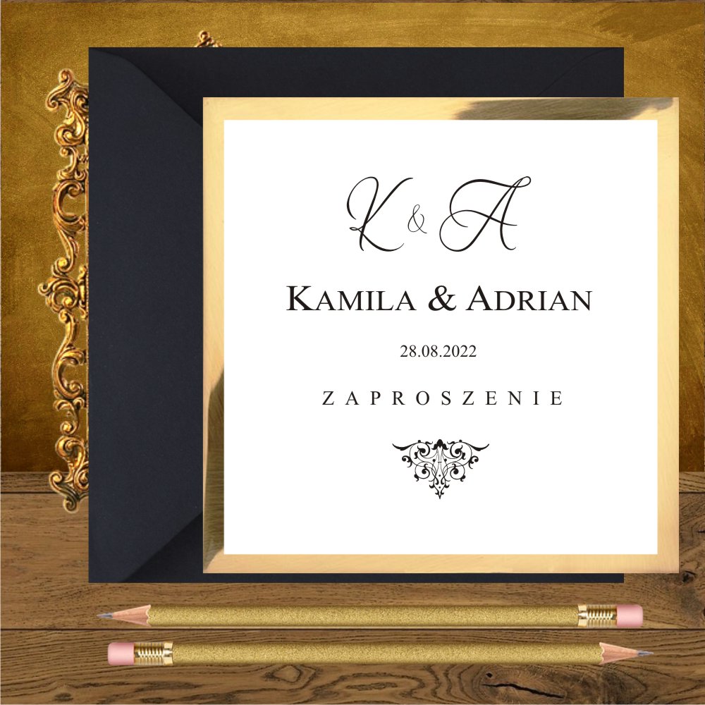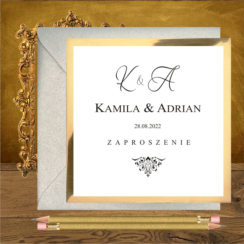 Eleganckie, stylowe złoto czarne zaproszenia na ślub wykonane z papieu białego i złotego. Na przodzie oryginalny ornament. Elegancji dodaja koperty w kolorze srebrnym i złotym. Bardzo ciekawy efekt uzyskujemy wybierając kopertę zieloną, rózową czy bordo. Na okładce zaproszenia widnieją inicjały pisane ozdobną czcionką, mimo to zaproszenie ma charakter minimalistyczny.