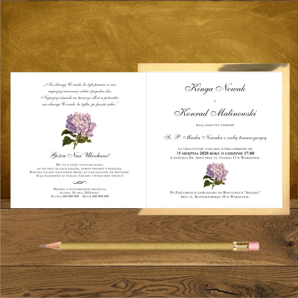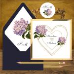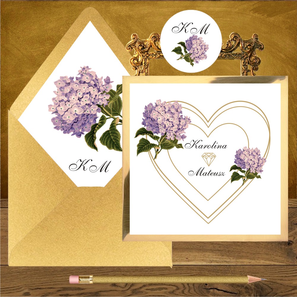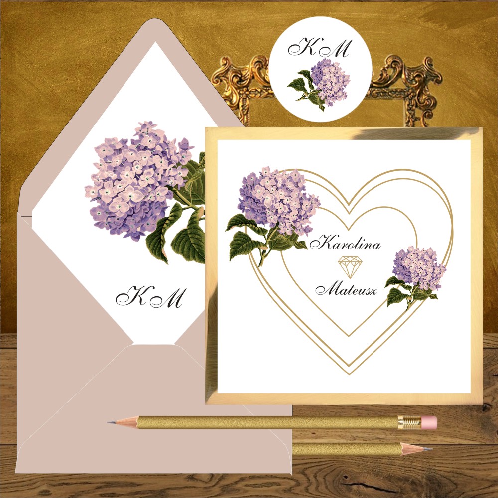 Hortensje różowe i złote serce. Zaproszenia slubne z różowymi hortensjami glamour, ekskluzywne