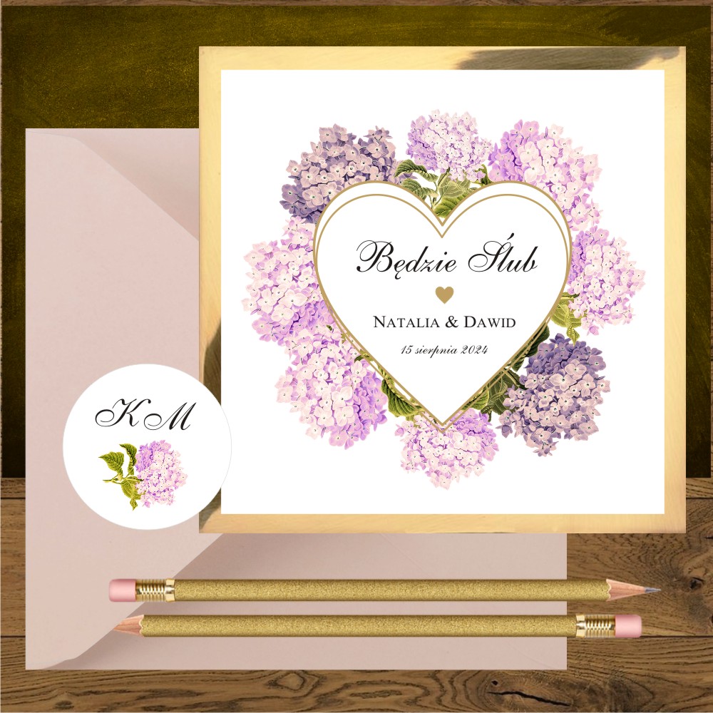 Zaproszenia rozowe hortensje i serce zlote
