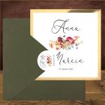Zaproszenia ślubne w stylu boho z elementami błyszczącego złota , kwiaty w bukiecie łączą nowoczesność z tradycją. Kolory bordo, delikatny błękit, zgaszona zieleń nawiązują do natury, co odzwierciedla luźna kompozycja. Zaproszenia są wykonane z pięknego aksamitnego papieru podklejonego błyszczącym lustrzanym złotym kartonikiem. Niebanalna czcionka nadaje zaproszeniom stylu. Do wyboru koperty w kolorze pastelowego różu, różowy nude ,biała, ecru, złota, bordo. Szczególnie pięknie prezentuje się z koperta bordo i złota. Zaproszenie może być personalizowane w środku lub na kopercie.