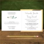 Opis: zaproszenia boho wykonane z pięknego złotego papieru i białego gładkiego. Na froncie zielone listki eukaliptusa i kwiaty jaśminu ułozone w rodziaj bukietu. Piękny nowoczesny zielono złoty wzór zaproszeń w stylu rustykalnym, boho