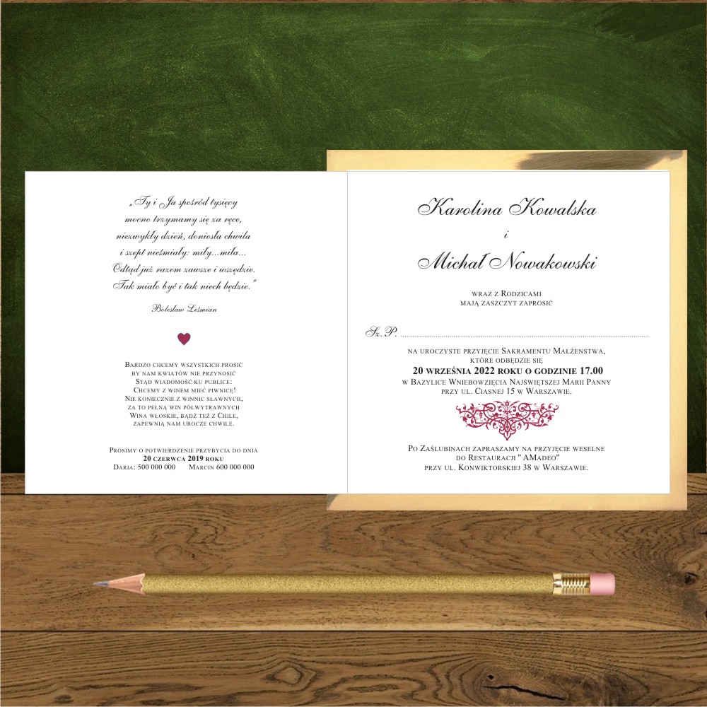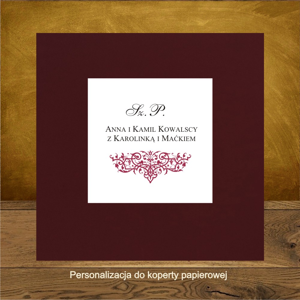 Zaproszenie glamour z ozdobnymi ornamentami na froncie zaproszenia w kolorze bordowym.
