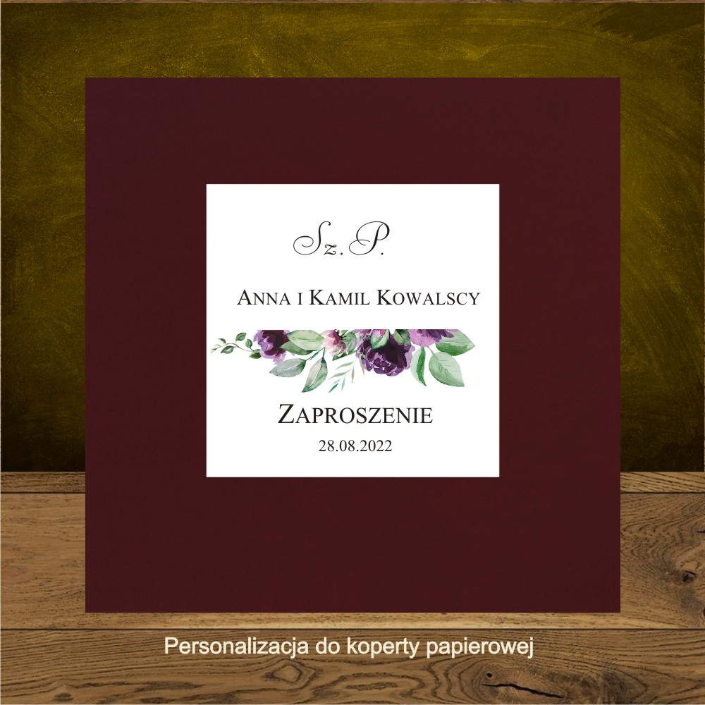 Opis: zaproszenia wykonane z pięknego złotego papieru i białego gładkiego. Na froncie oryginalne kwiaty w kolorze fioletowym i zielone gałązki ułożone w fantazyjny wzór. Zaproszenie w stylu boho, rustykalnym, ekskluzywne.
