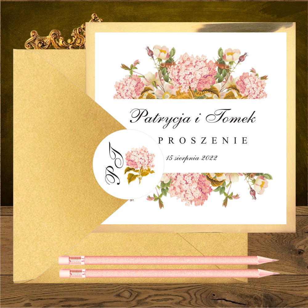 Zaproszenia ślubne glamour hortensje rózowe i jaśmin
