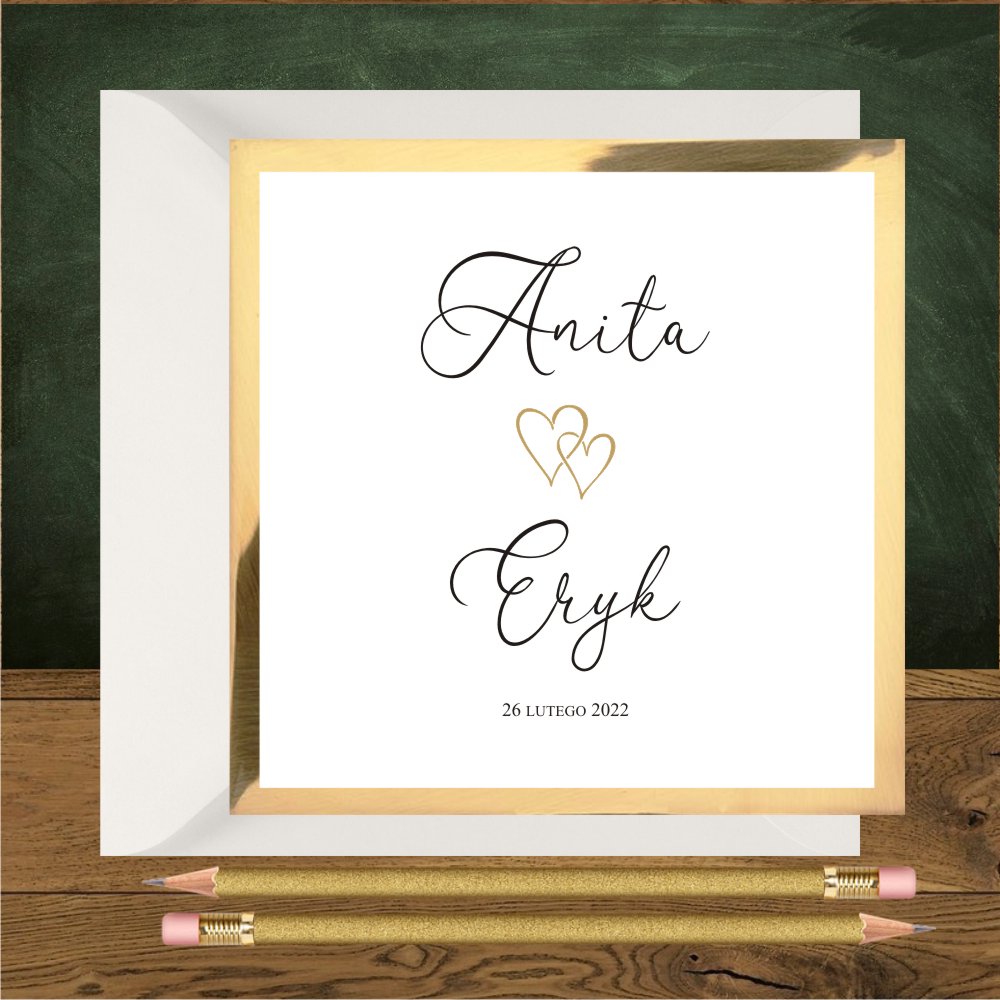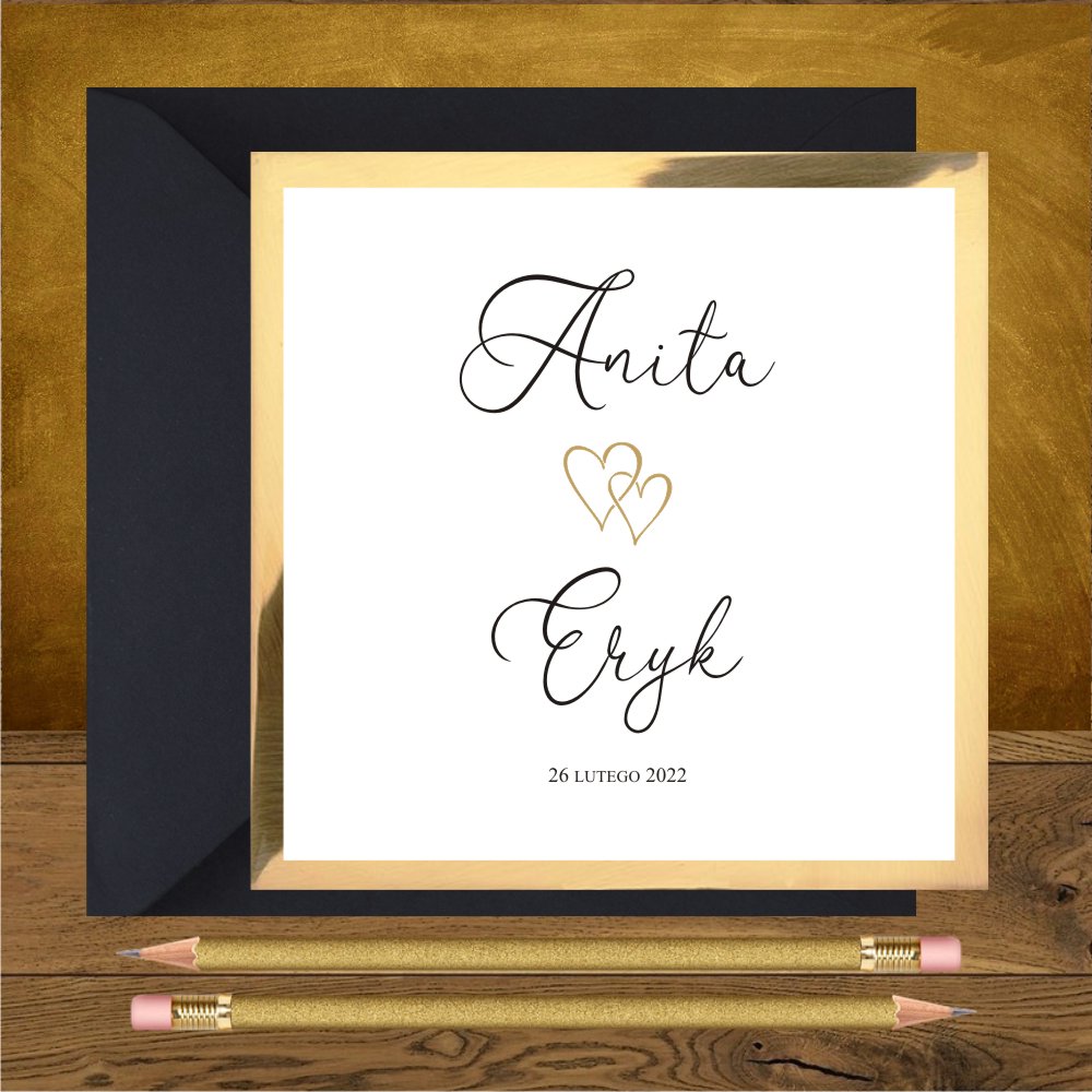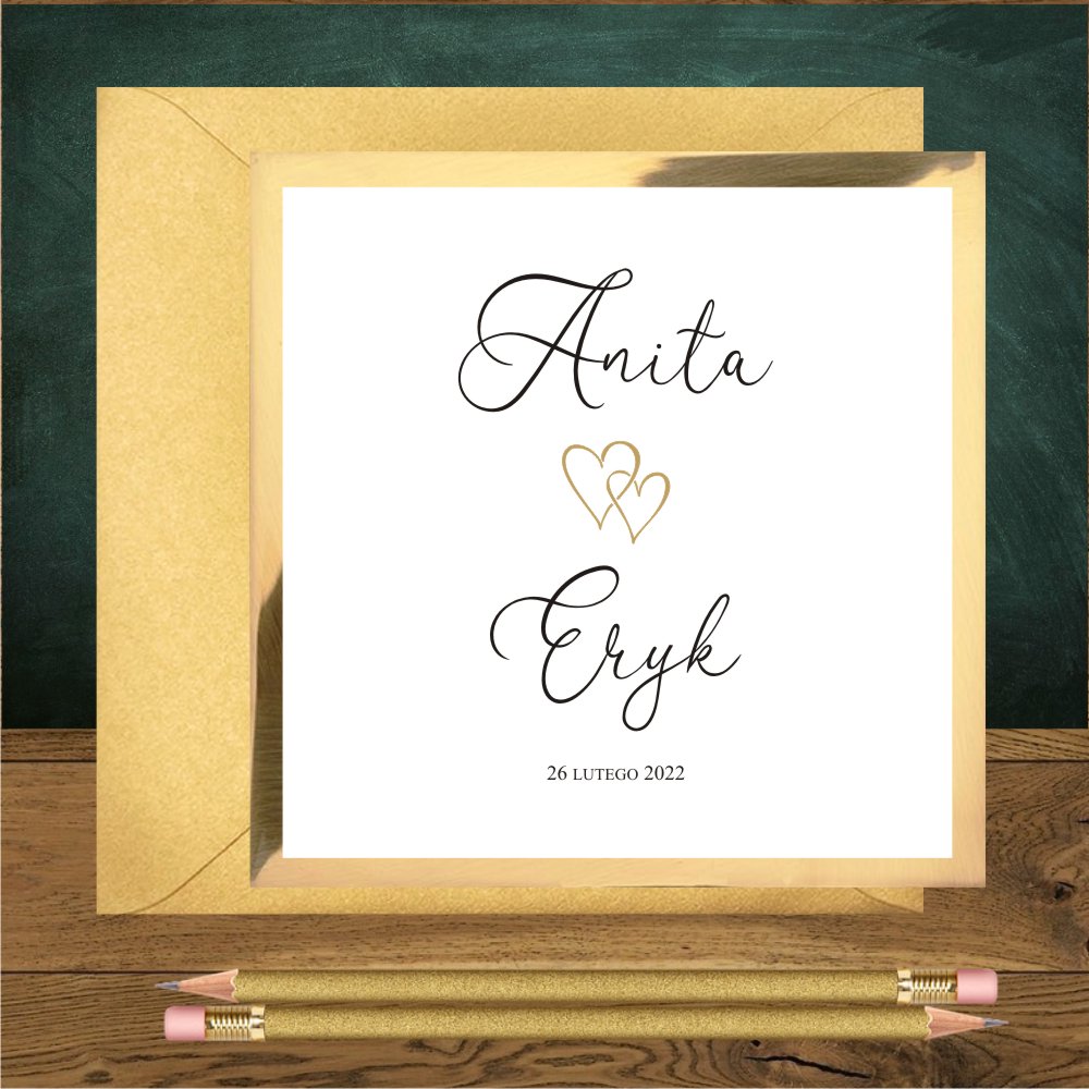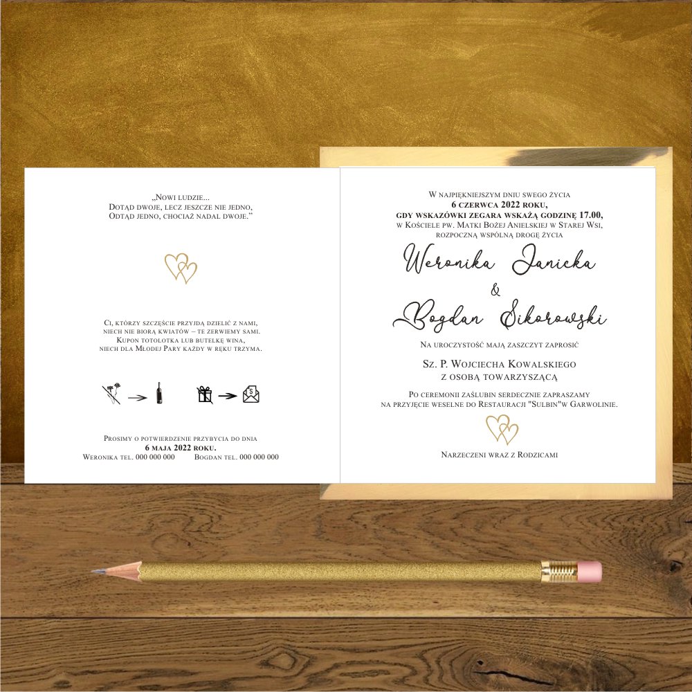 Zaproszenia ślubne minimalistyczne z dwoma złotymi serduszkami