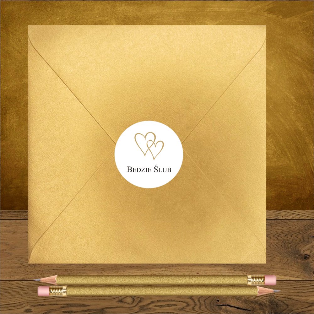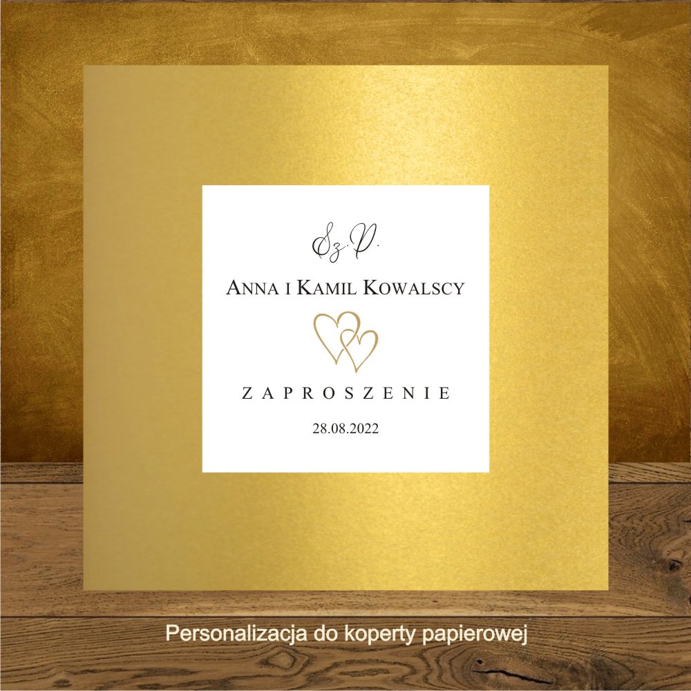Personalizacja koperty papierowej. Druk na papierze takim jak zaproszenia. Na naklejce grafika złotych serc. |