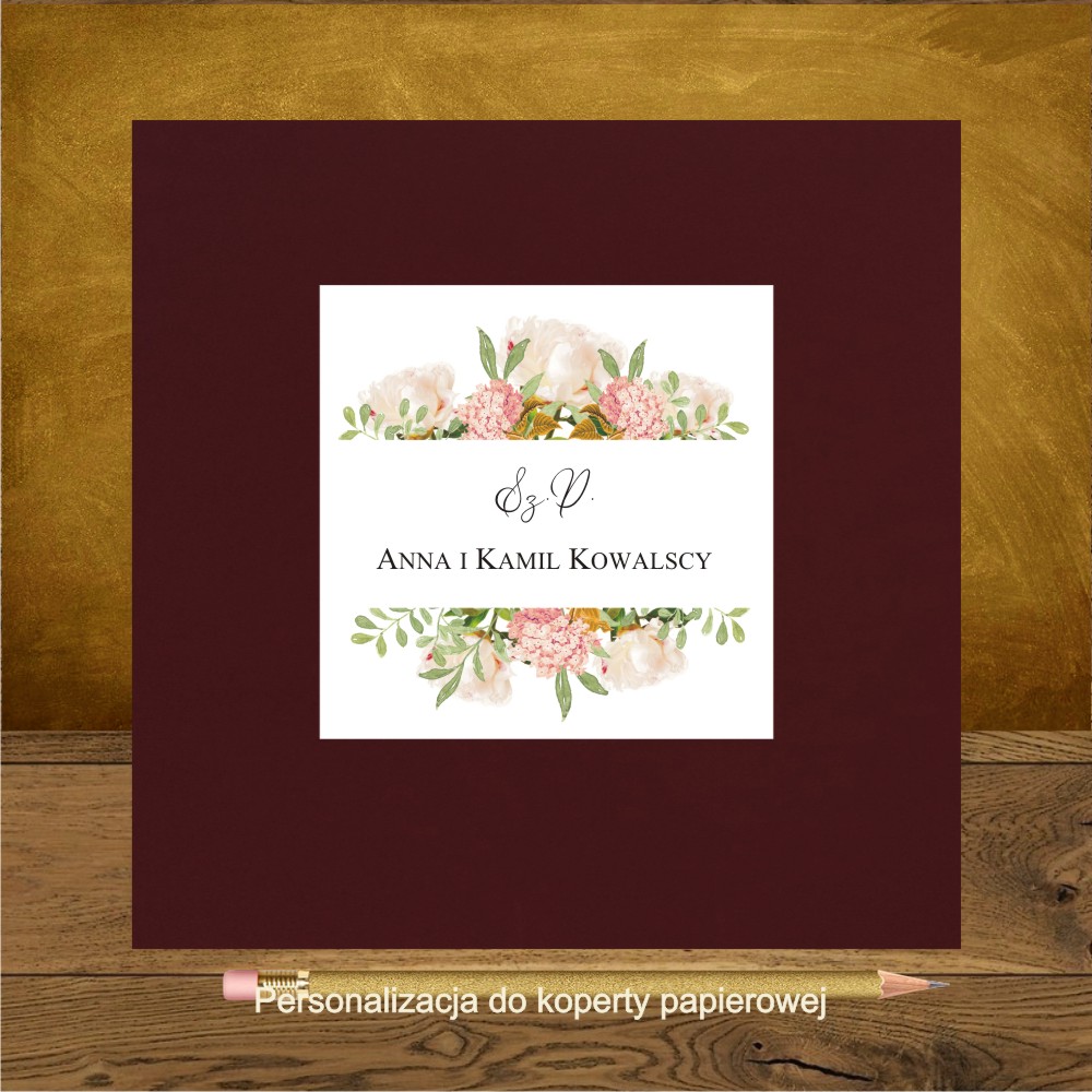 Oryginalne z bordowym serduszkiem i pięknymi różowymi kwiatami w kopercie. Uroku dodaje naklejka na kopertę w kształcie kółeczka i personalizacja koperty