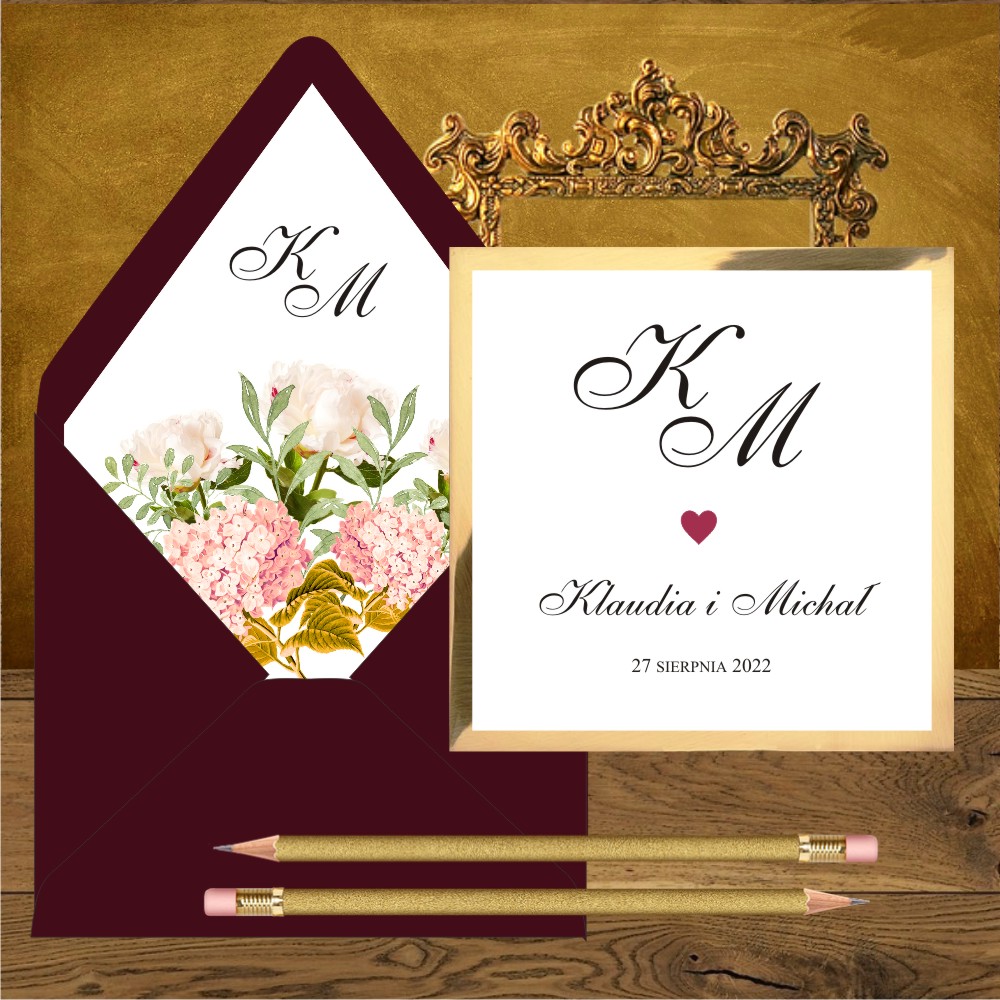 Zaproszenia ślubne glamour z serduszkiem bordo i kwiatami rózowymi