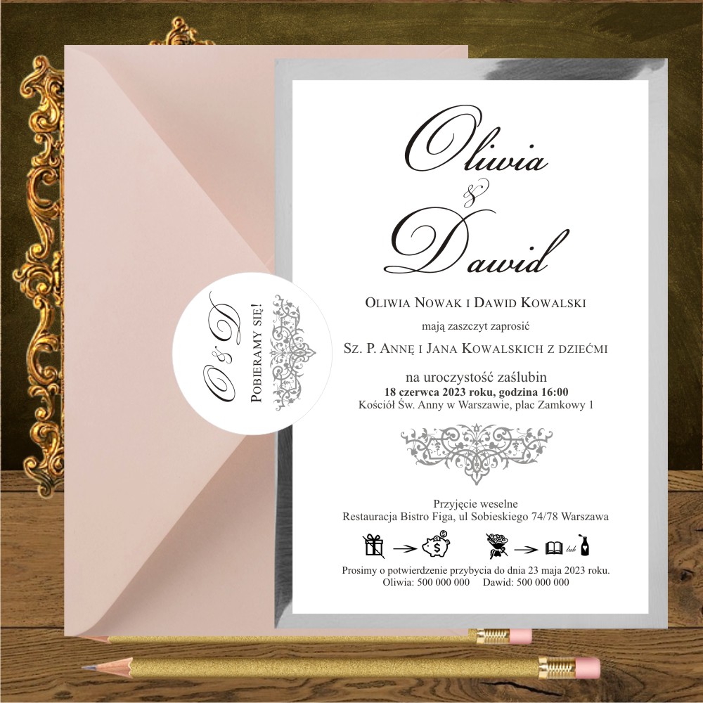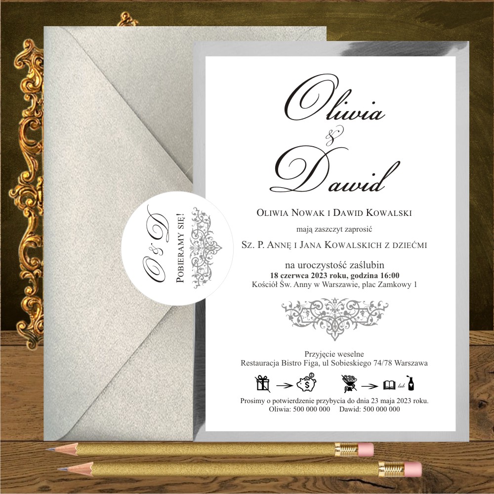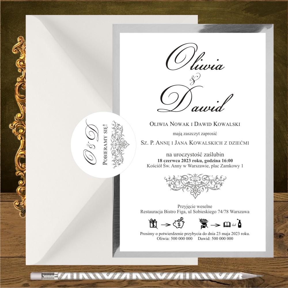 Zaproszenia na ślub ze srebrnymi ornamentami. Oliwia srebro