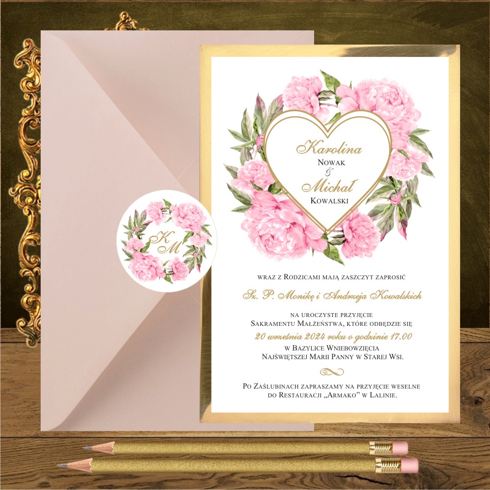 Zaproszenia slubne Piwonie romantyczny różowy i serce. Koperta wyklejana