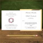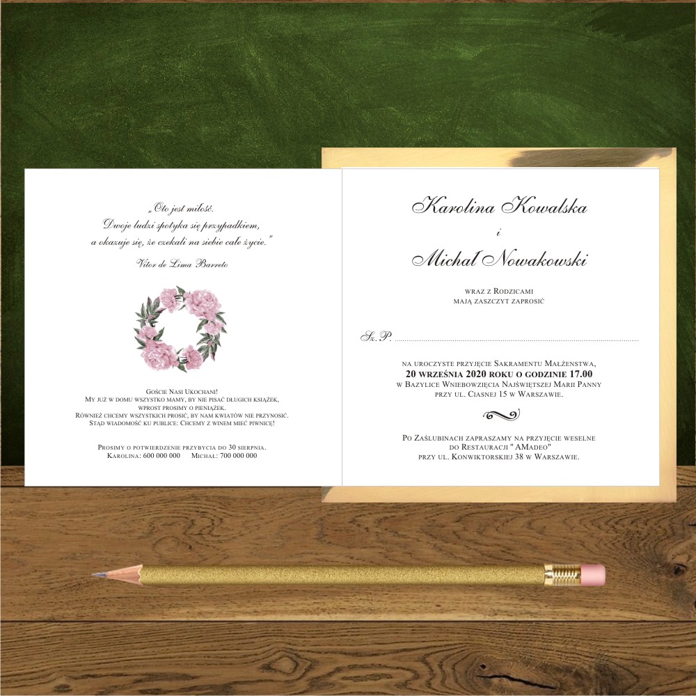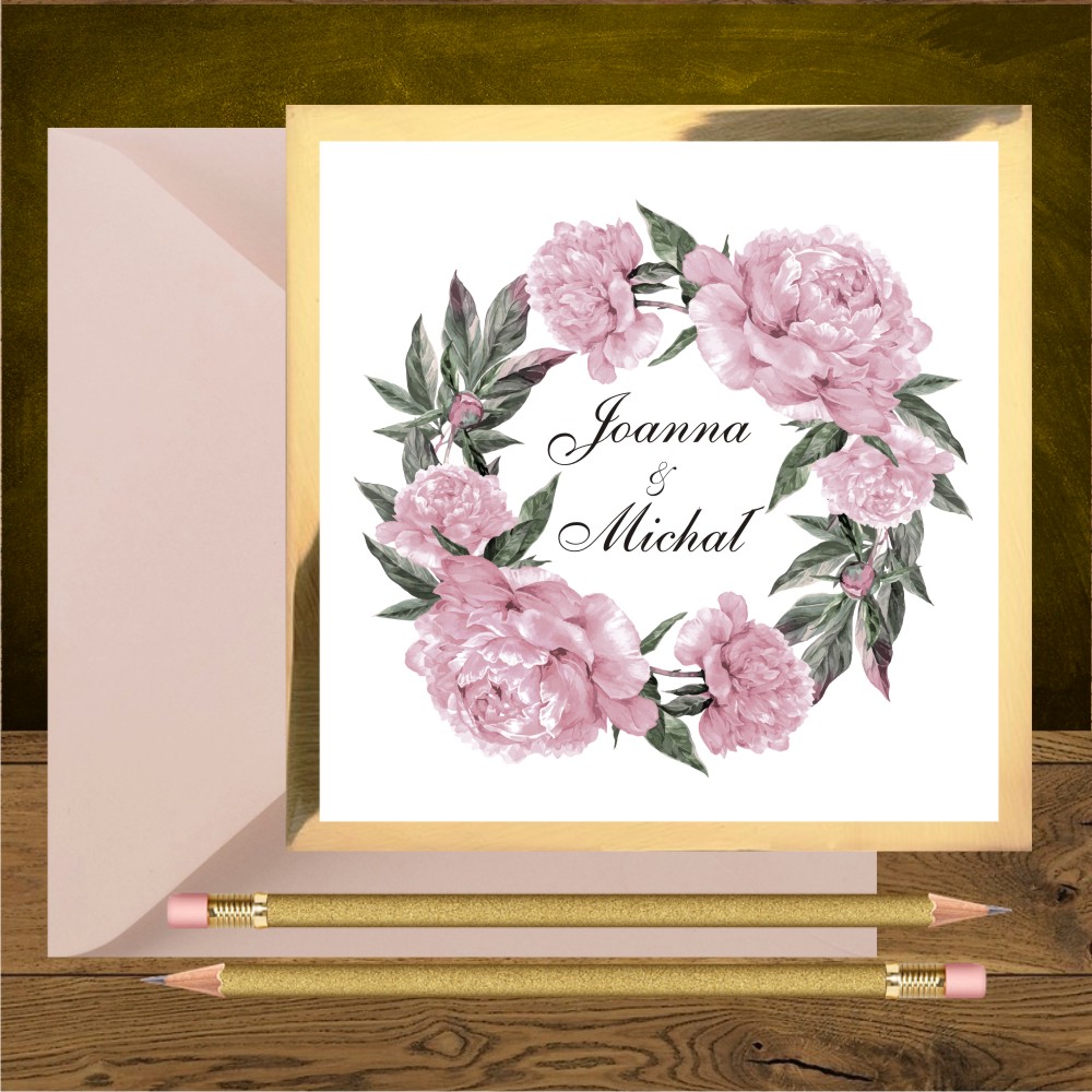 Złoto rózowe kwiatowe zaproszenia z pastelowymi piwoniami w wianku z dodatkiego koloru złotego w postaci złotego podklejenia.