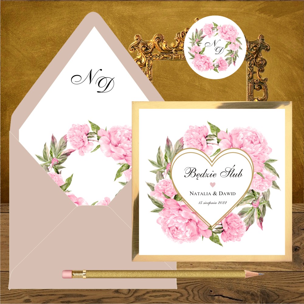 Zaproszenia slubne Piwonie romantyczny różowy i serce. Koperta wyklejana