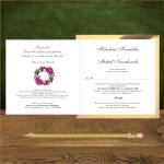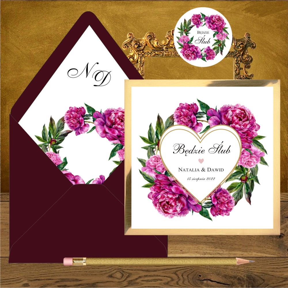 Ekskluzywne zaproszenia slubne piwonie wianek fuksja. Zaproszenie w kolorach złota i fuksji