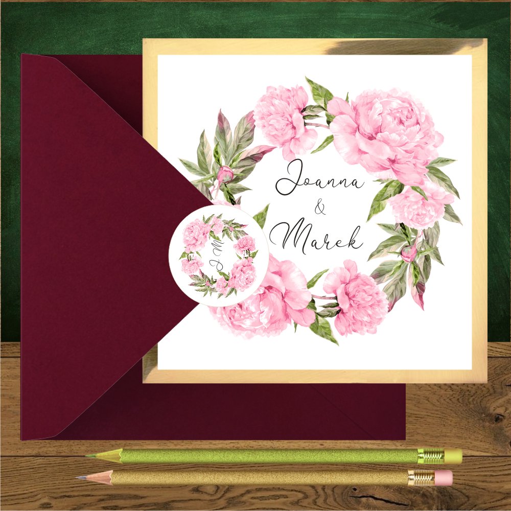 Zaproszenia ślubne do kościoła lub na ślub cywilny – to zaproszenia boho, kwiatowe z pięknym dużym wiankiem dorodnych różowych piwonii i delikatnych zielonych liści dla romantyków marzących o ślubie rustykalnym w ogrodzie. Zaproszenia czy zawiadomienia są wykonane z pięknego białego papieru podklejonego sztywnym lustrzanym złotym kartonikiem, Luksusowy połysk podklejki zmienia charakter zaproszenia na bardziej eleganckie. Zaproszenia ślubne boho z motywem różowych piwonii pasują cudownie do kopert różowych Wyjątkowo oryginalnie zaproszenie prezentuje się ze złotą lub bordową kopertą oraz okrągłą naklejką z uroczym wianuszkiem. Zaproszenie może być personalizowane w środku lub na kopercie.