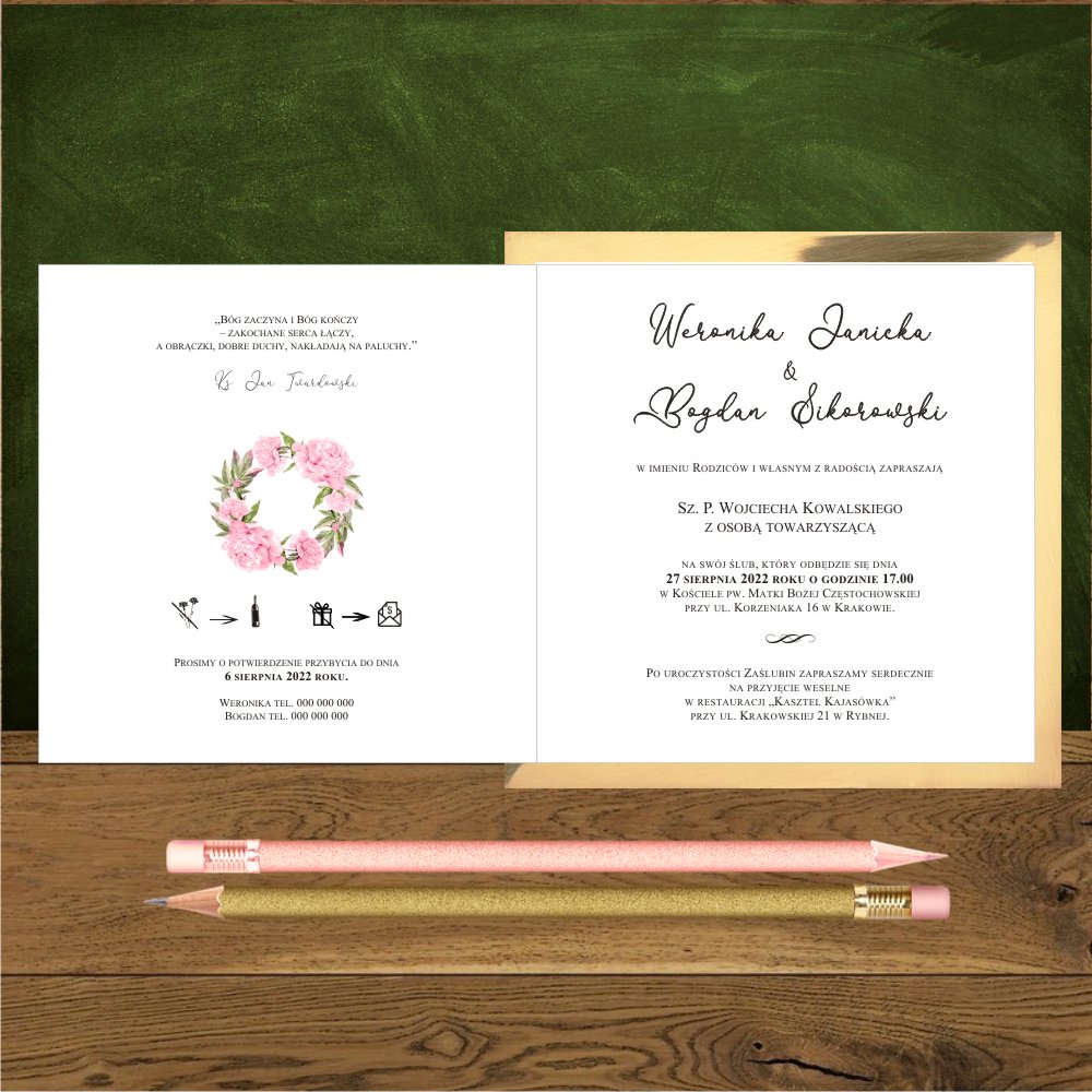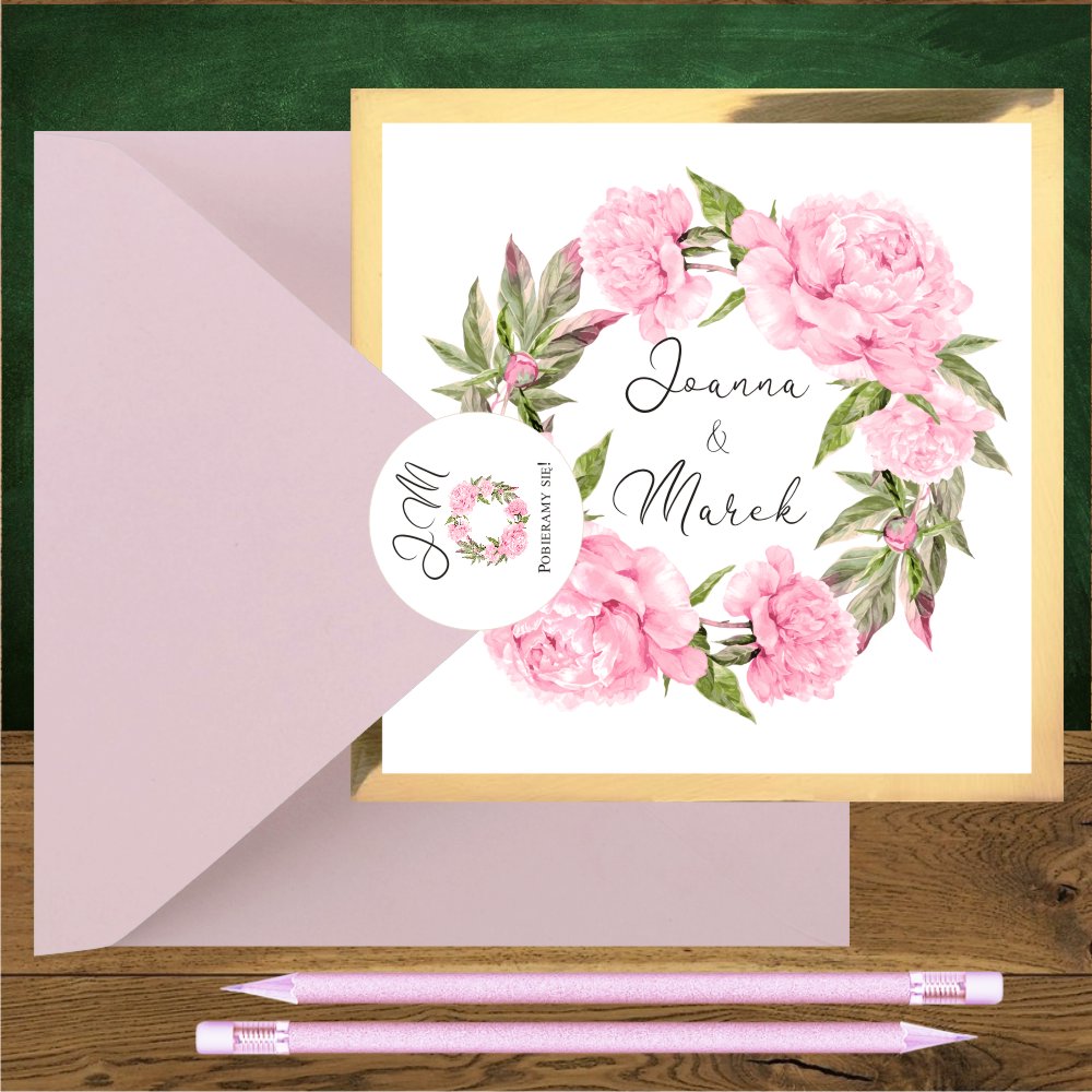 Zaproszenia ślubne z różowymi piwoniami. Kwadratowe na złotym kartoniku. Piwonie romantyczny różowy