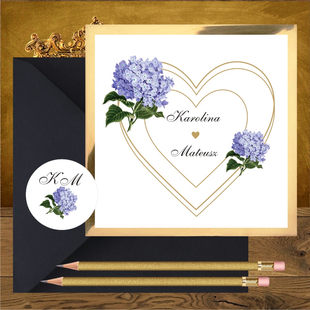 Zaproszenia z niebieskimi hortencjami i złote serce