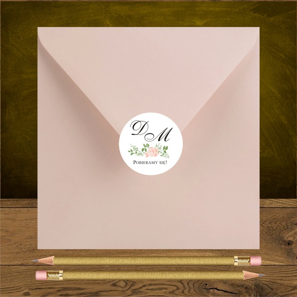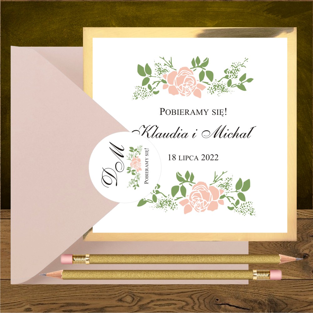Zaproszenia ślubne kwiatowe. Róże łososiowe i zielone listki