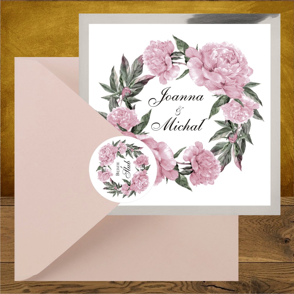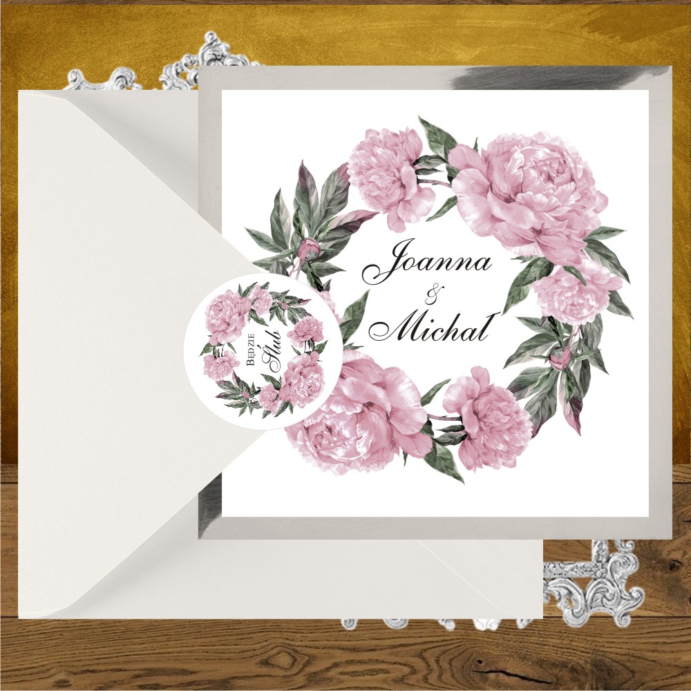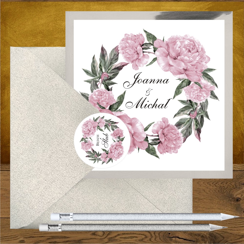 Zproszenia na wesele z piwoniami srebro różowe. Lodowy rózowy