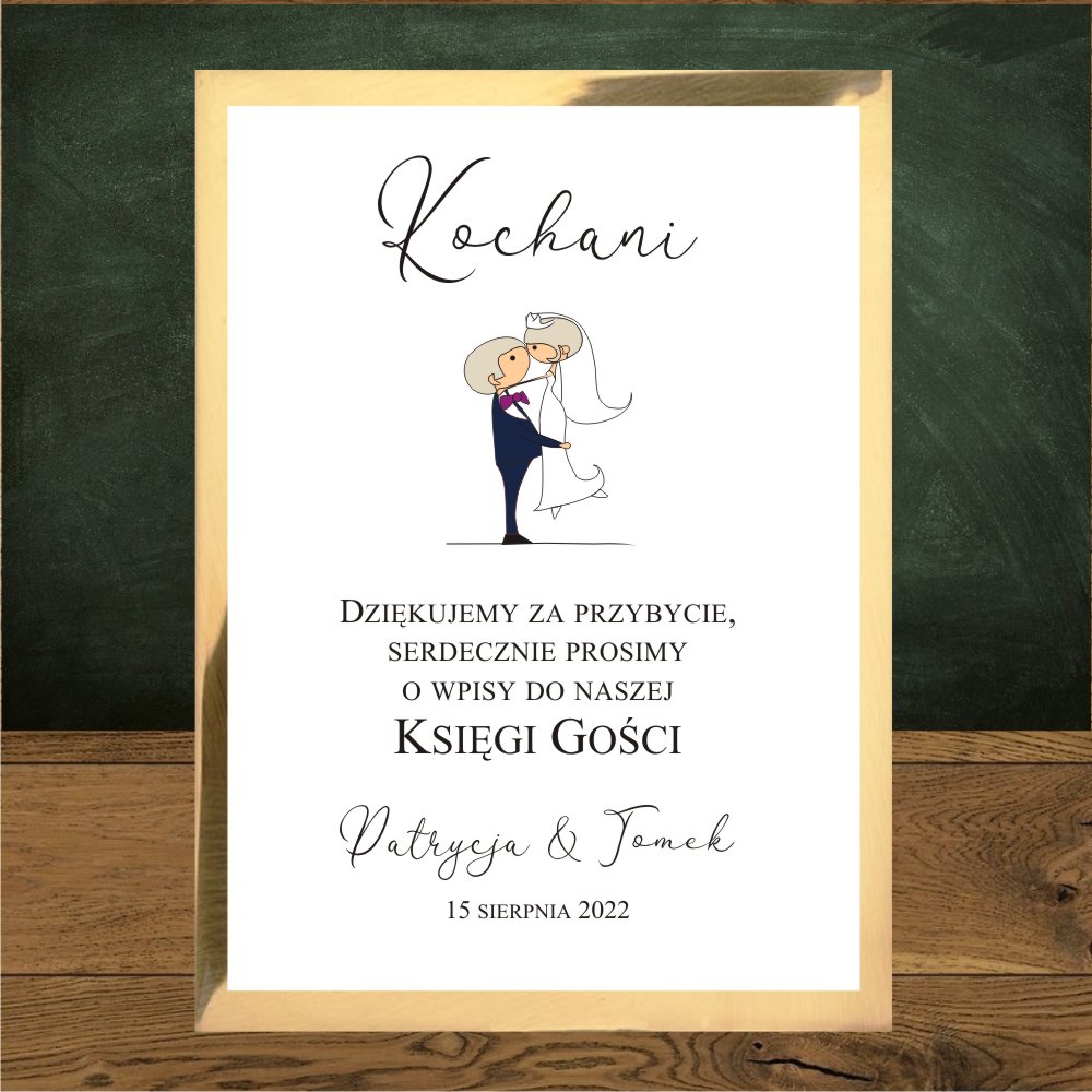 Instrukcja do księgi Gości pełni funkcję informacyjną, dodatkowo jest pięknie podklejona złotym błyszczącym papierem. Dopełnieniem jest wesoły motyw z Parą Młodą.