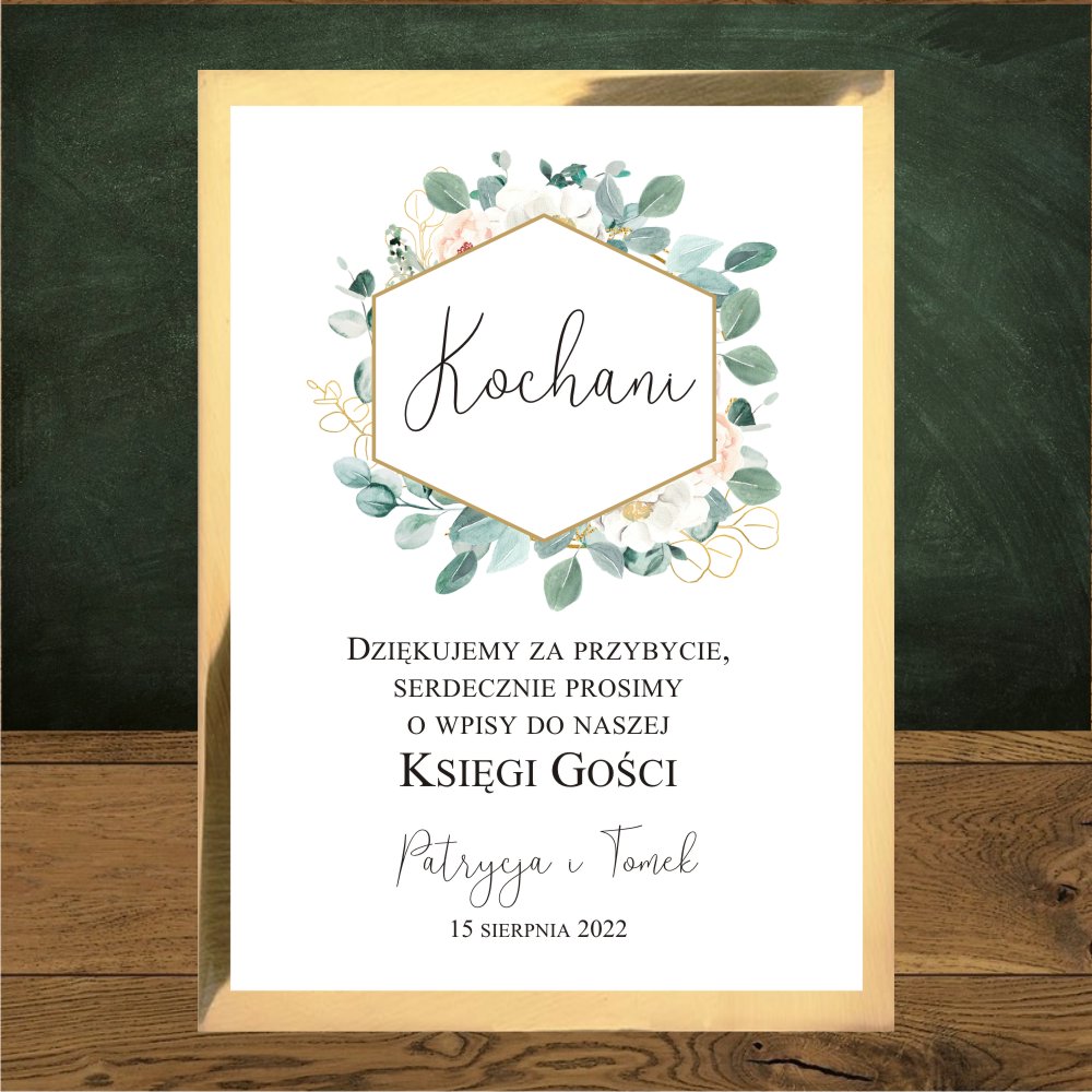 Instrukcja do księgi Gości pełni funkcję informacyjną, modny geometryczny akcent i eukaliptus