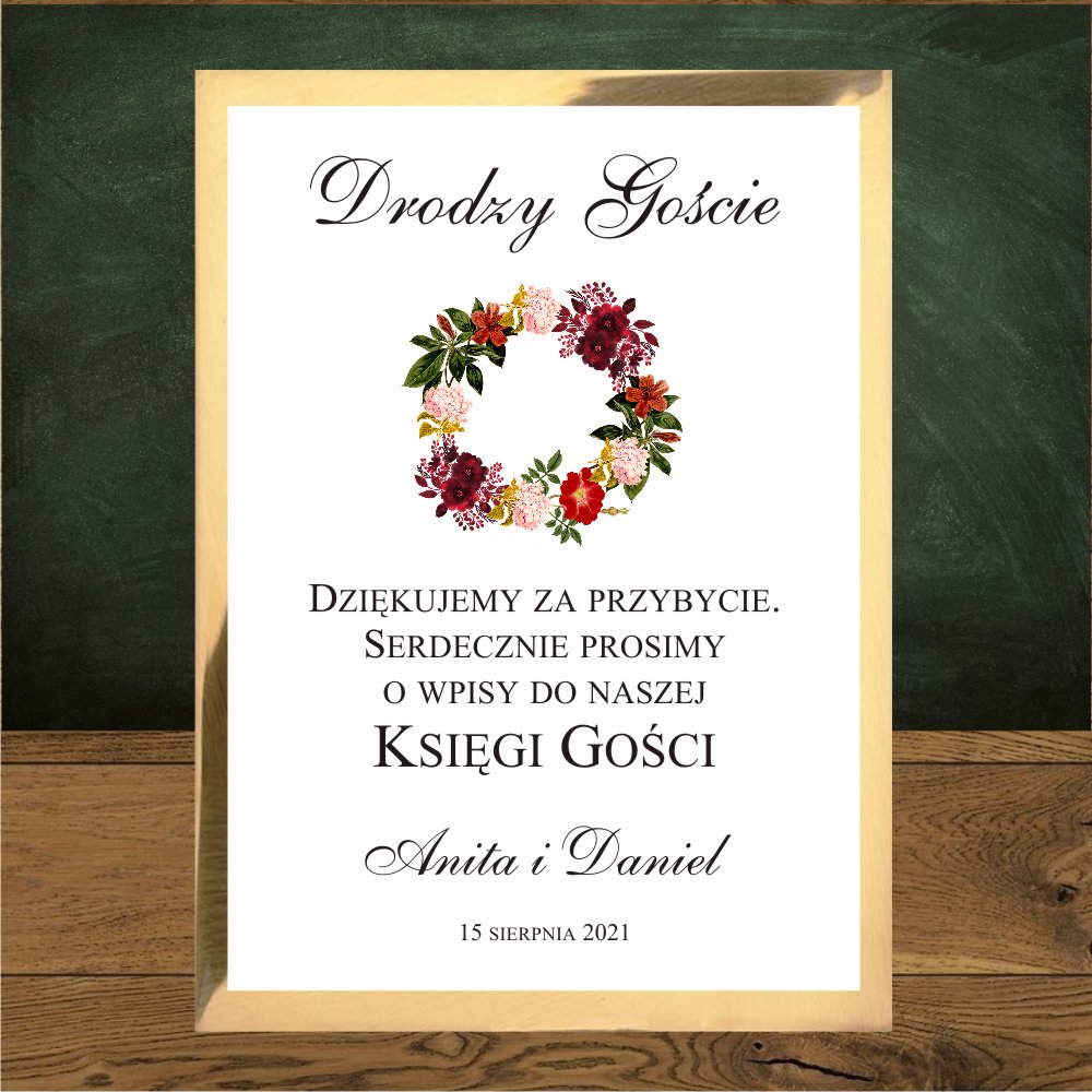 Zaproszenia ślubne boho na złotym kartoniku, kwadratowe. Wianek kwiaty bordo