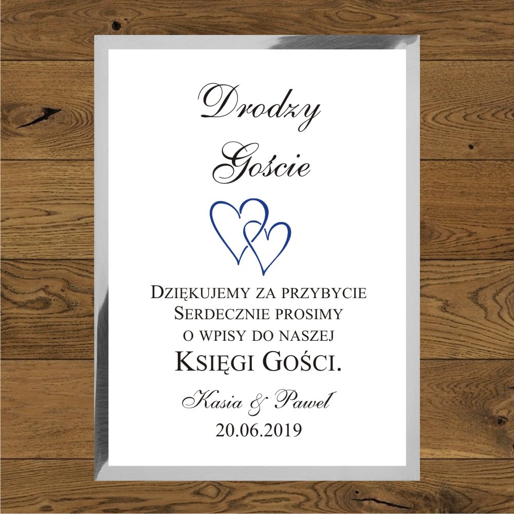 Minimalistyczne dwa małe serduszka granatowe. Papier złoty mirror i biały-księga gosci
