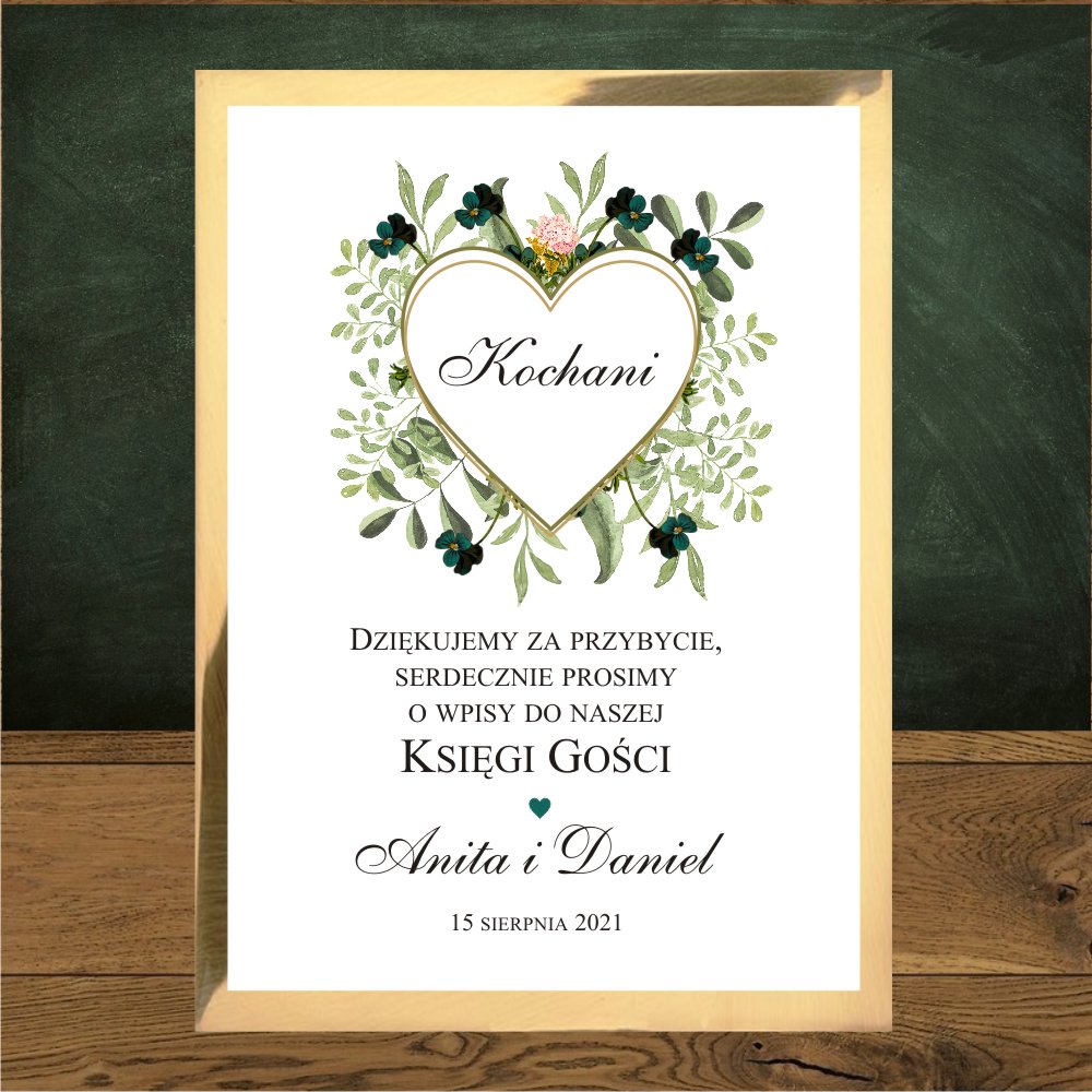 Księga gości wesele. Zielone listki , szmaragdowe kwiatki i serce