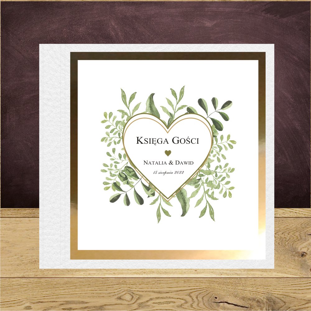 Księga gości do wpisów z romantycznym sercem w zielonych gałązkach.