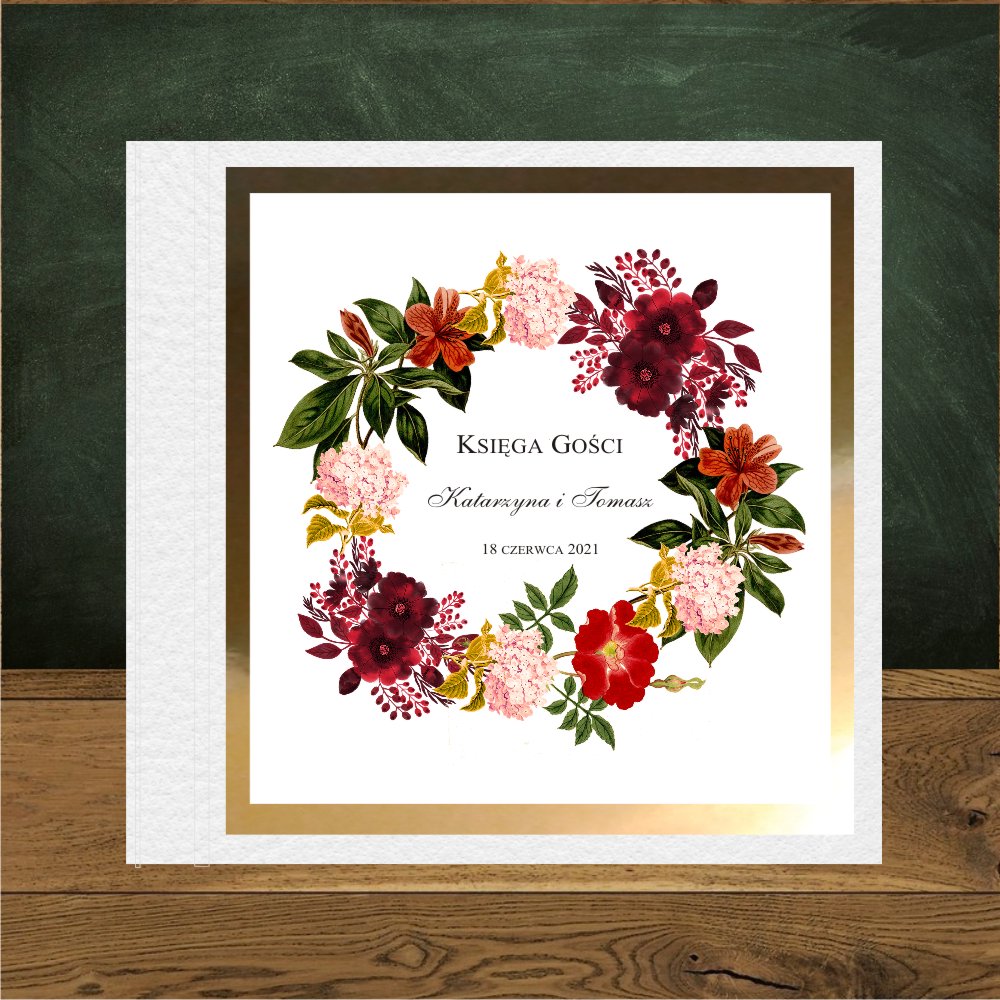 Zaproszenia ślubne boho na złotym kartoniku, kwadratowe. Wianek kwiaty bordo