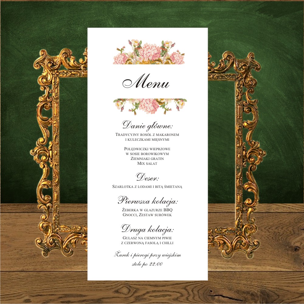 Menu na stół weselny jednostronne z kwiatami hortensji i jaśminu.