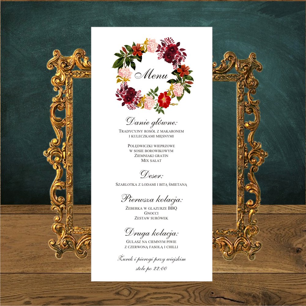 Zaproszenia ślubne boho z kwiatami. Wianek kwiaty boho