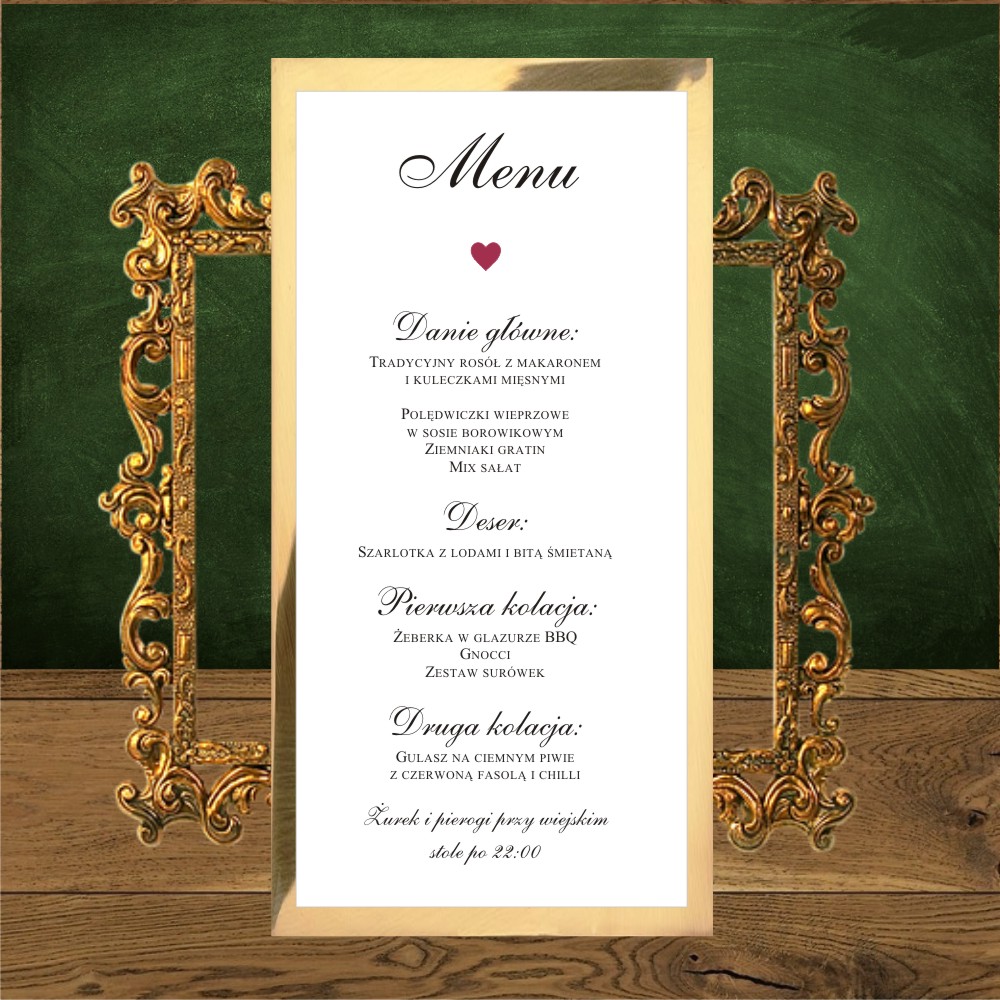 Menu jednostronne z serduszkiem bordo z podklejeniem