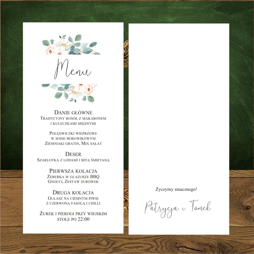 Menu na stół weselny jednostronne z eukaliptusem.