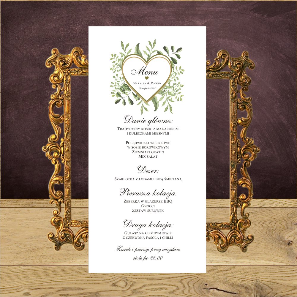 Menu ślubne na stoły.Eleganckie botaniczne z uroczym sercem.