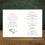Menu weselne ze złotym podklejeniem. Zielone gałązki delikatne