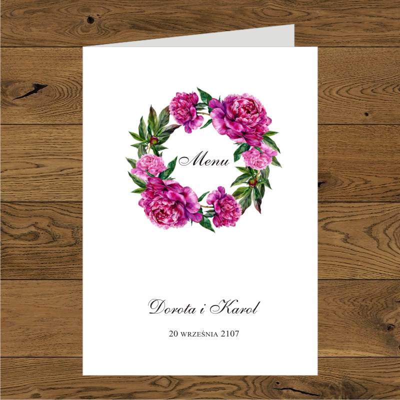 Menu jednostronne z piwoniami. Piwonie fuksja