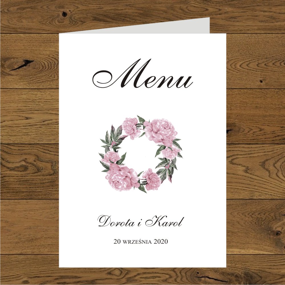 Piwonie- wianek pastelowy różowy jednostronne menu weselne