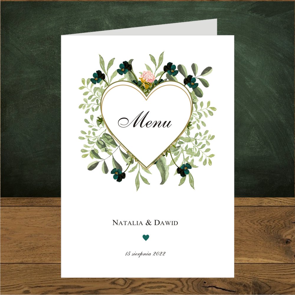 Menu ślubne na stół weselny otwierane.Romantyczne serce w szmaragdowych kwiatach i listkach w stylu boho.