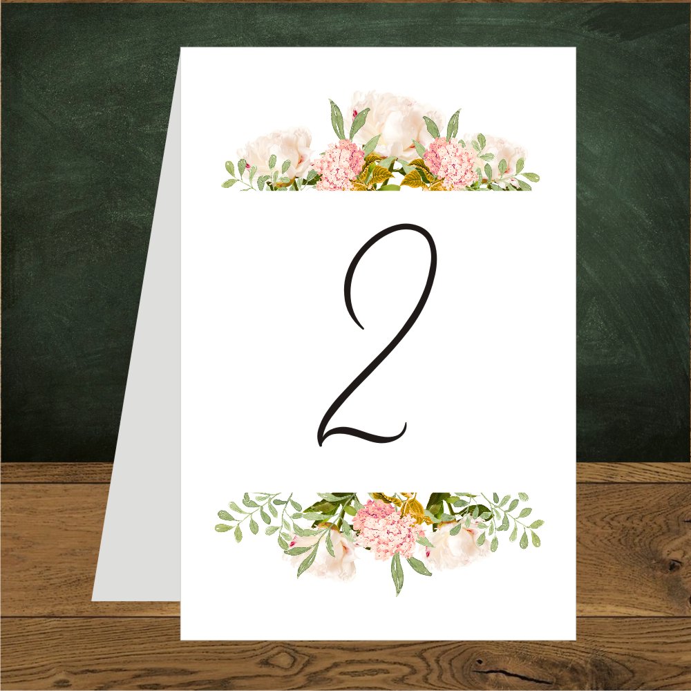Numerki na stół weselny. Piękne różowe hortensje z zielonymi listkami w stylu rustykalnym.