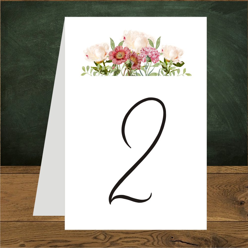 Numerki na stół weselny. Romantyczny motyw kremowych piwonii i ciemnoróżowych goździków.