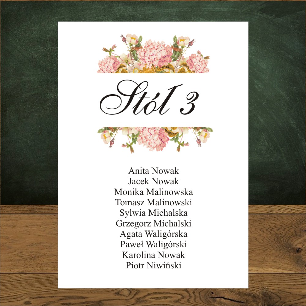 Plan stołów. Personalizowane karteczki do samodzielnego montażu z motywem kwiatów hortensji i jaśminu.