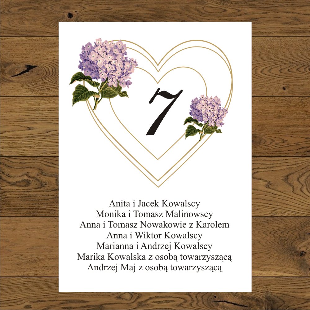 Hortensje różowe i złote serce. Numerki na stół z różową hortensją