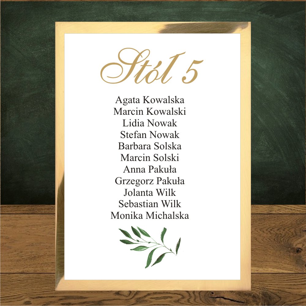 Numerki na stół weselny ze złotym podklejeniem. Zielone gałązki delikatne